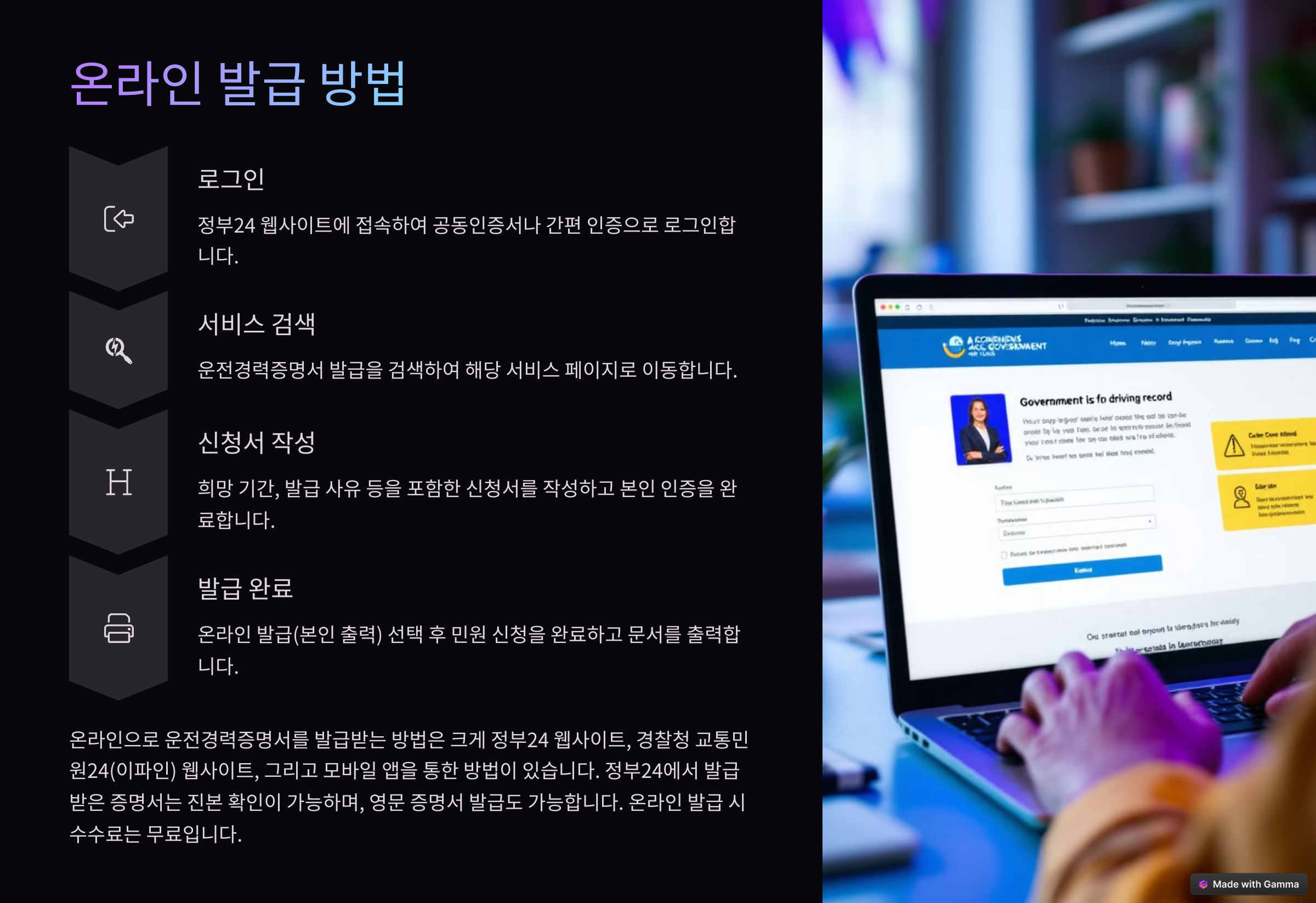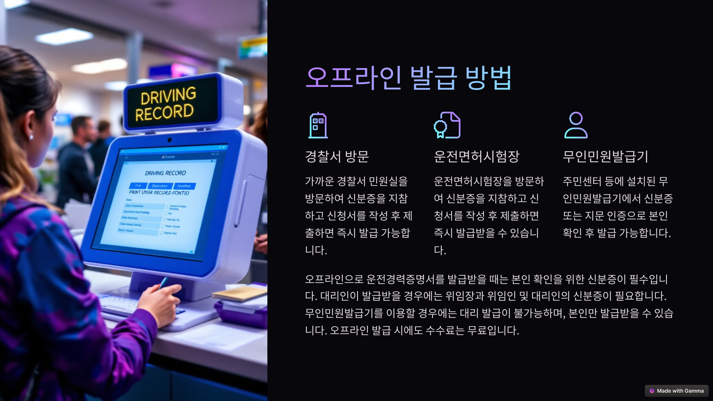 - 오프라인: 경찰서 또는 운전면허시험장에서 신청