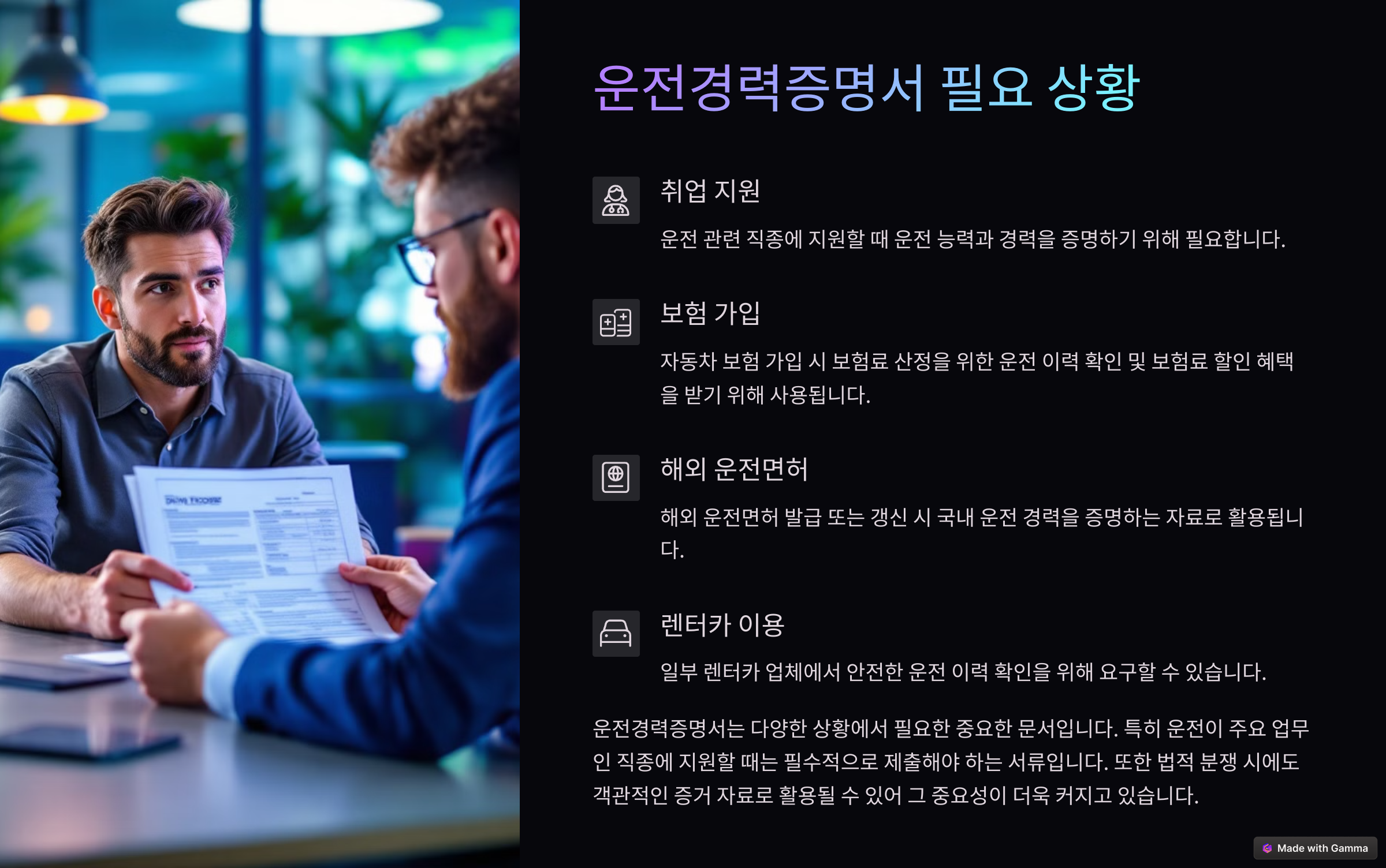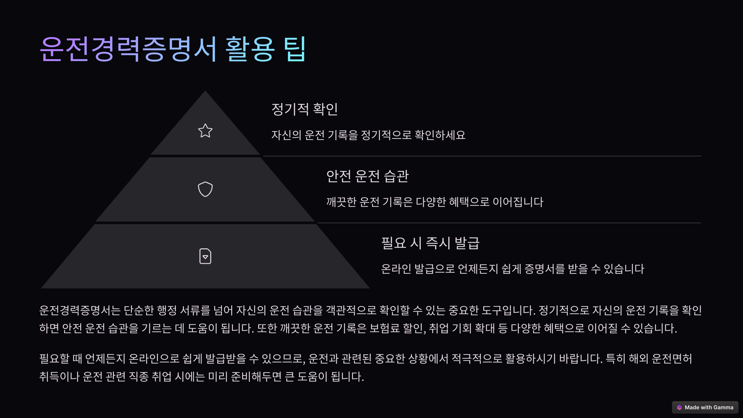 - 취업: 운전 관련 직종 지원 시 운전 능력과 경력 확인