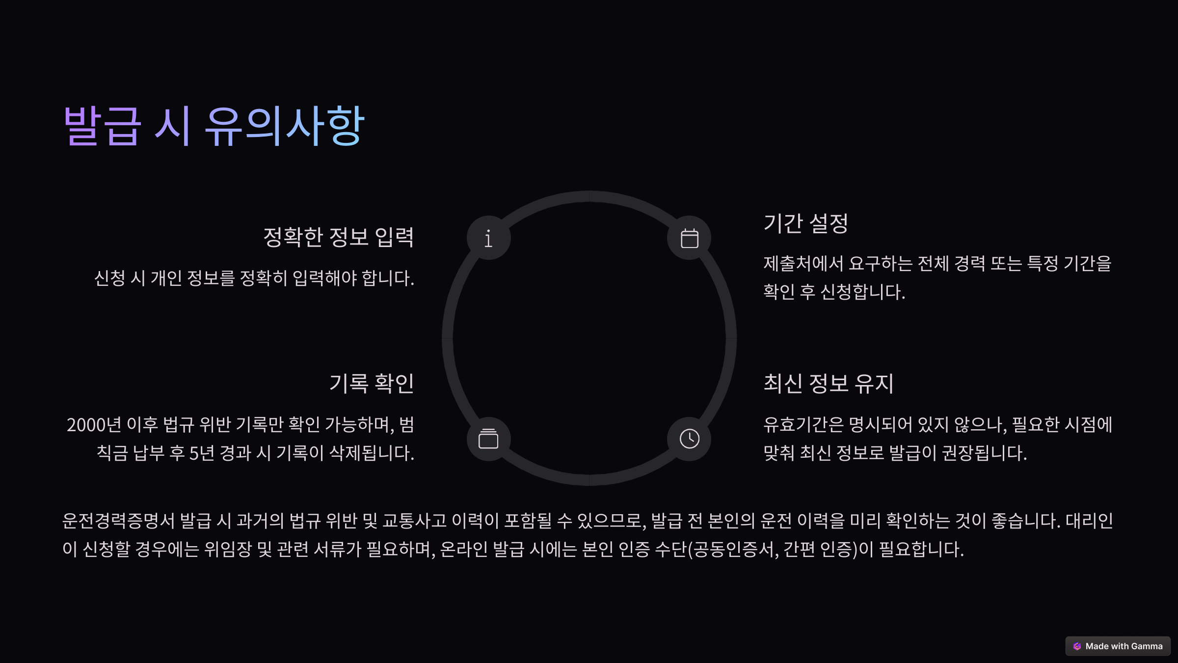 - 음주운전 기록: 운전경력증명서에 음주운전 관련 면허 정지/취소, 교통사고, 법규 위반 내역이 기록될 수 있음.