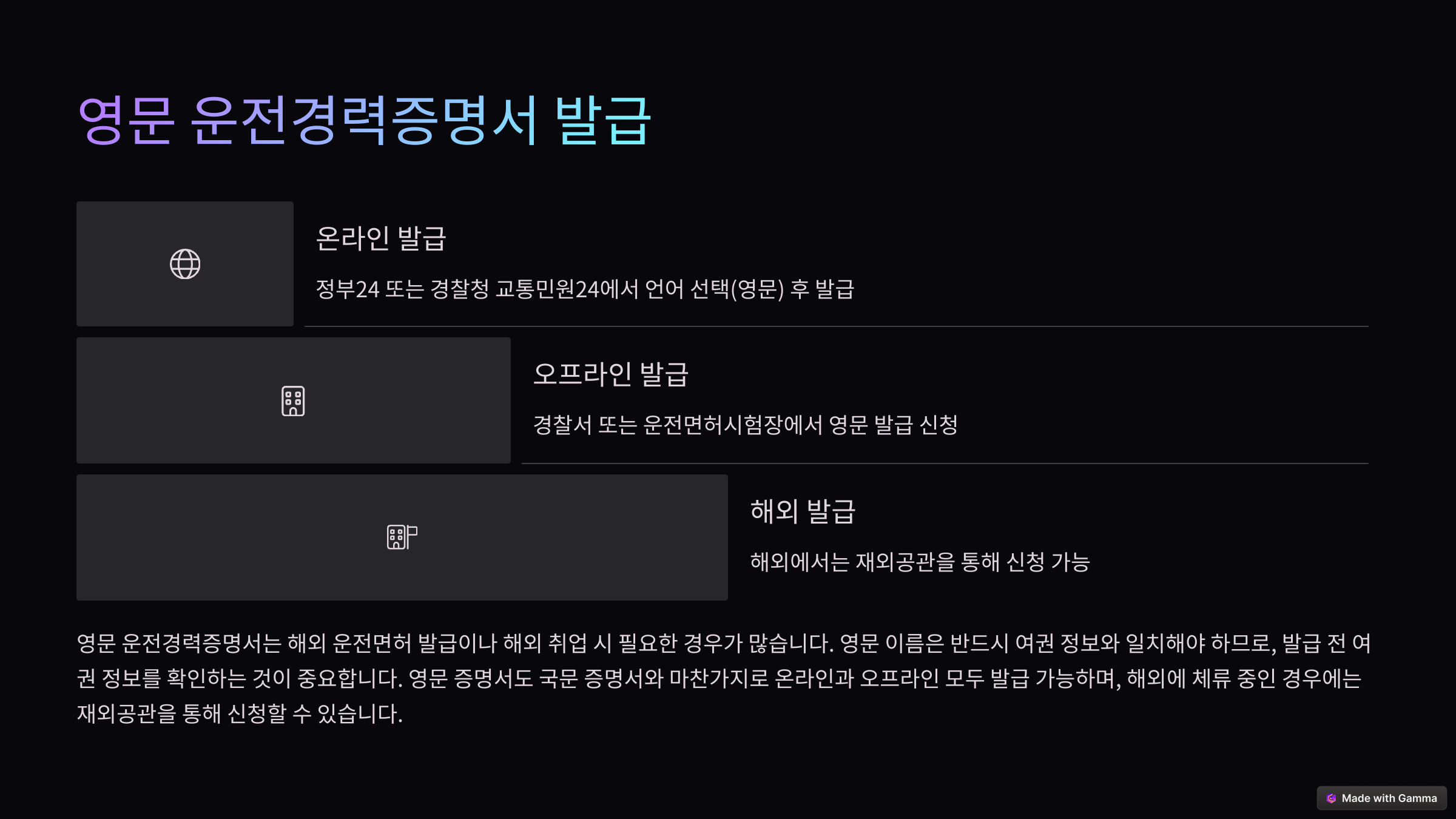 - 온라인: 정부24 또는 경찰청 교통민원24에서 발급 시 언어 선택 (영문)