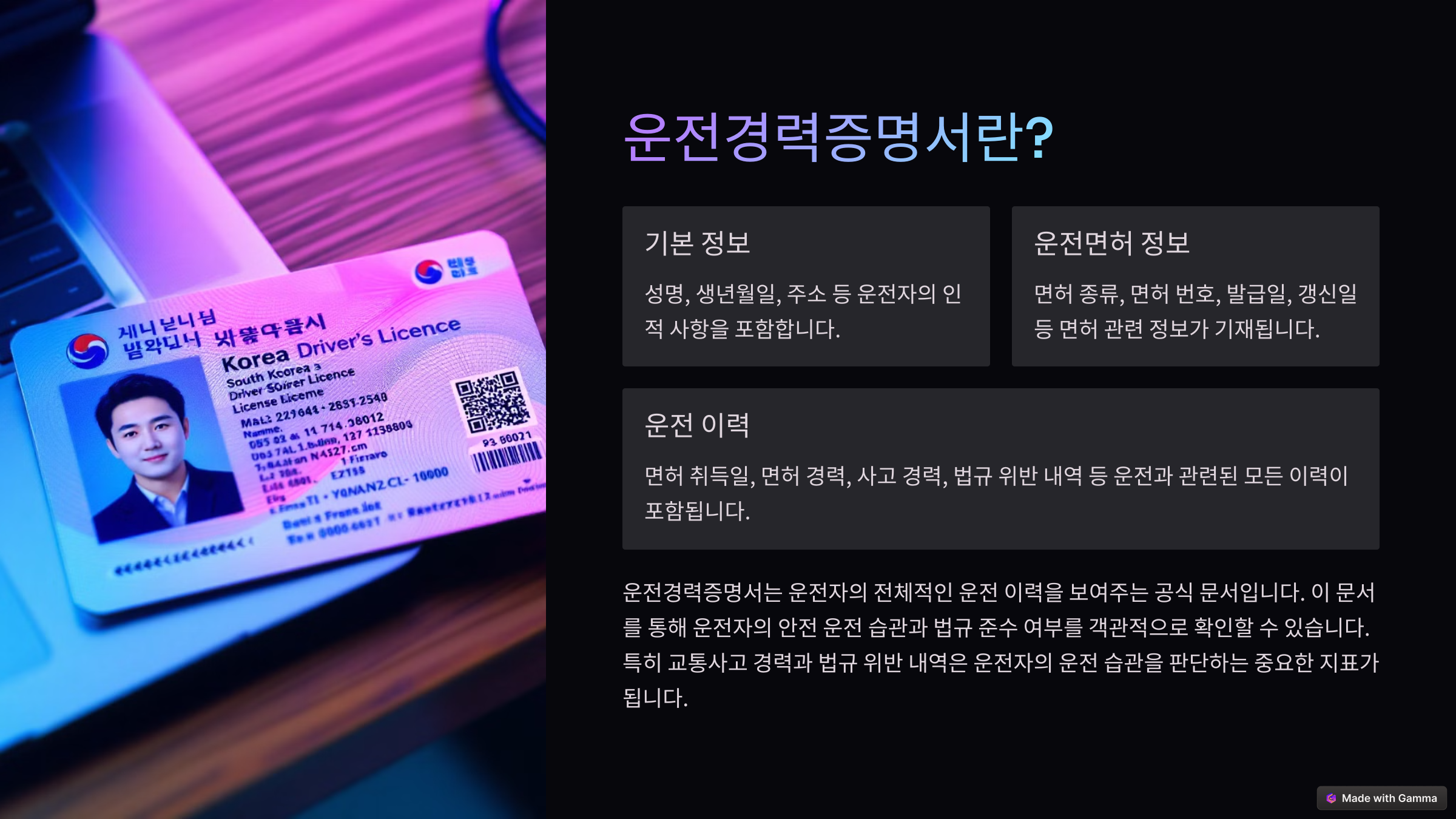 운전경력증명서는 운전자의 운전 경력을 증명하는 문서로, 운전면허 정보, 교통사고 및 법규 위반 내역 등을 포함한다. 주로 운전 관련 직종 취업, 보험 가입, 해외 운전면허 교환 등의 목적으로 사용된다.