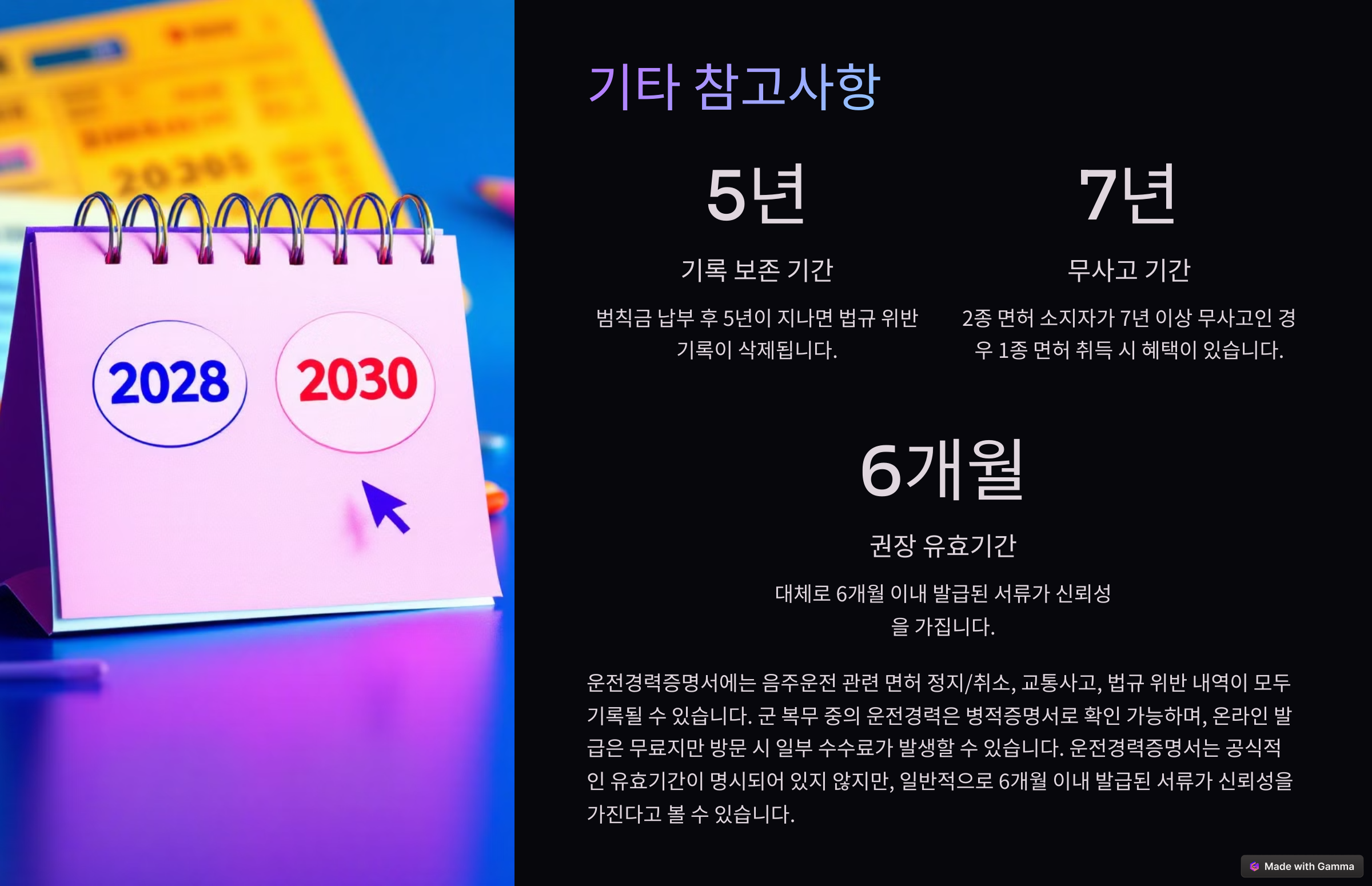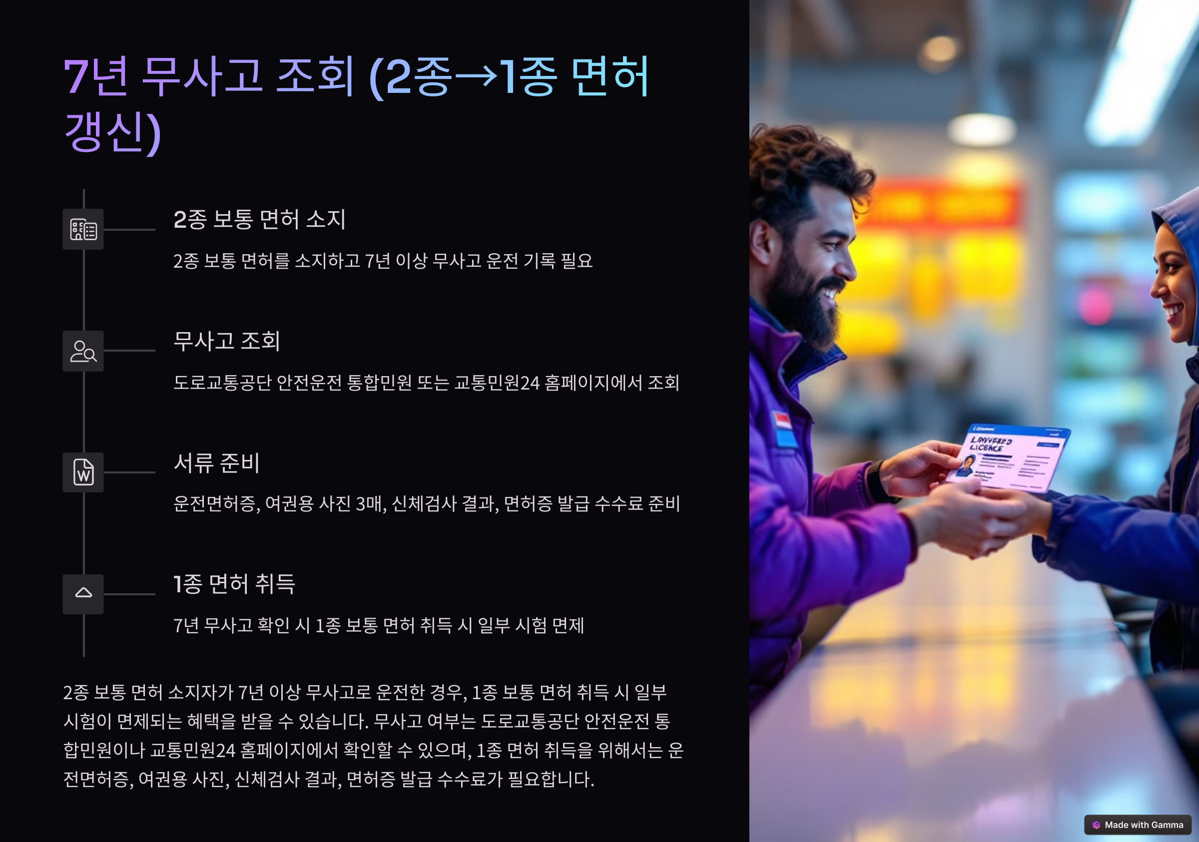 - 7년 무사고 조회: 2종 면허 소지자가 7년 이상 무사고인 경우 1종 면허 취득 시 일부 시험 면제 (도로교통공단에서 확인 가능).
