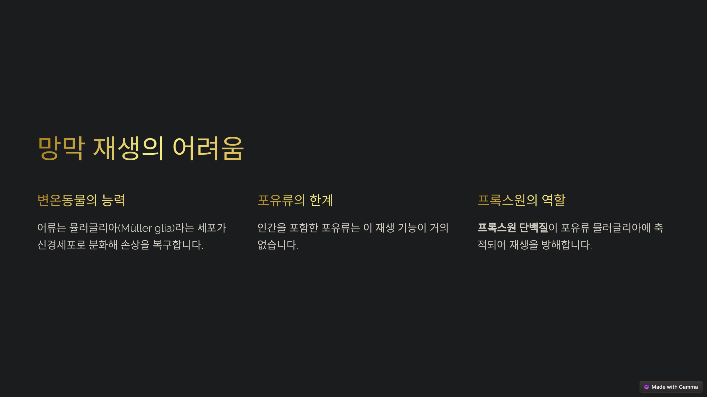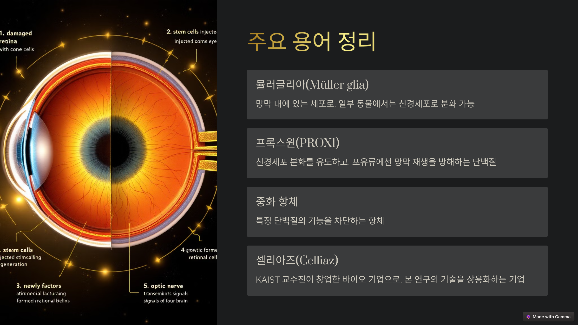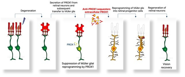 ➡️ 프록스원은 포유류에서 망막 재생을 억제하는 단백질로, 이를 제거하면 뮬러글리아 세포가 신경세포로 다시 분화할 수 있습니다. 재생을 막던 ‘브레이크’를 해제한 셈이죠.
