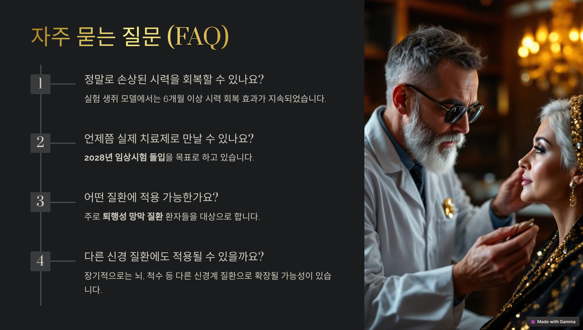- ✅ 6개월 이상 효과 지속: 실험 생쥐에서 시력 회복이 장기간 유지됨