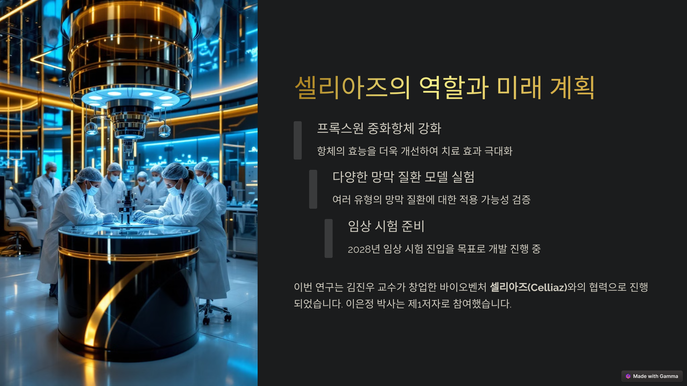 ➡️ 연구 결과를 바탕으로 바이오 기업 ‘셀리아즈’가 치료제 상용화를 준비 중이며, 2028년 임상시험 돌입을 목표로 하고 있습니다.