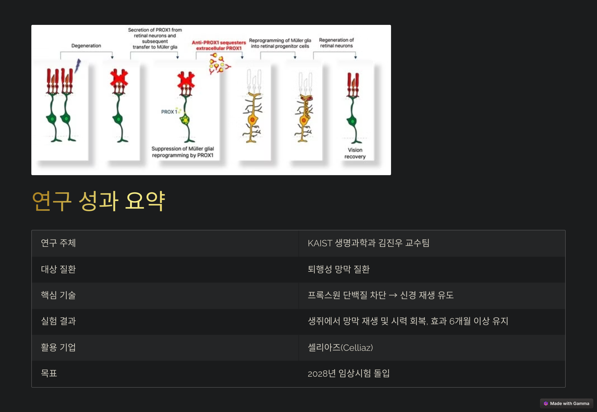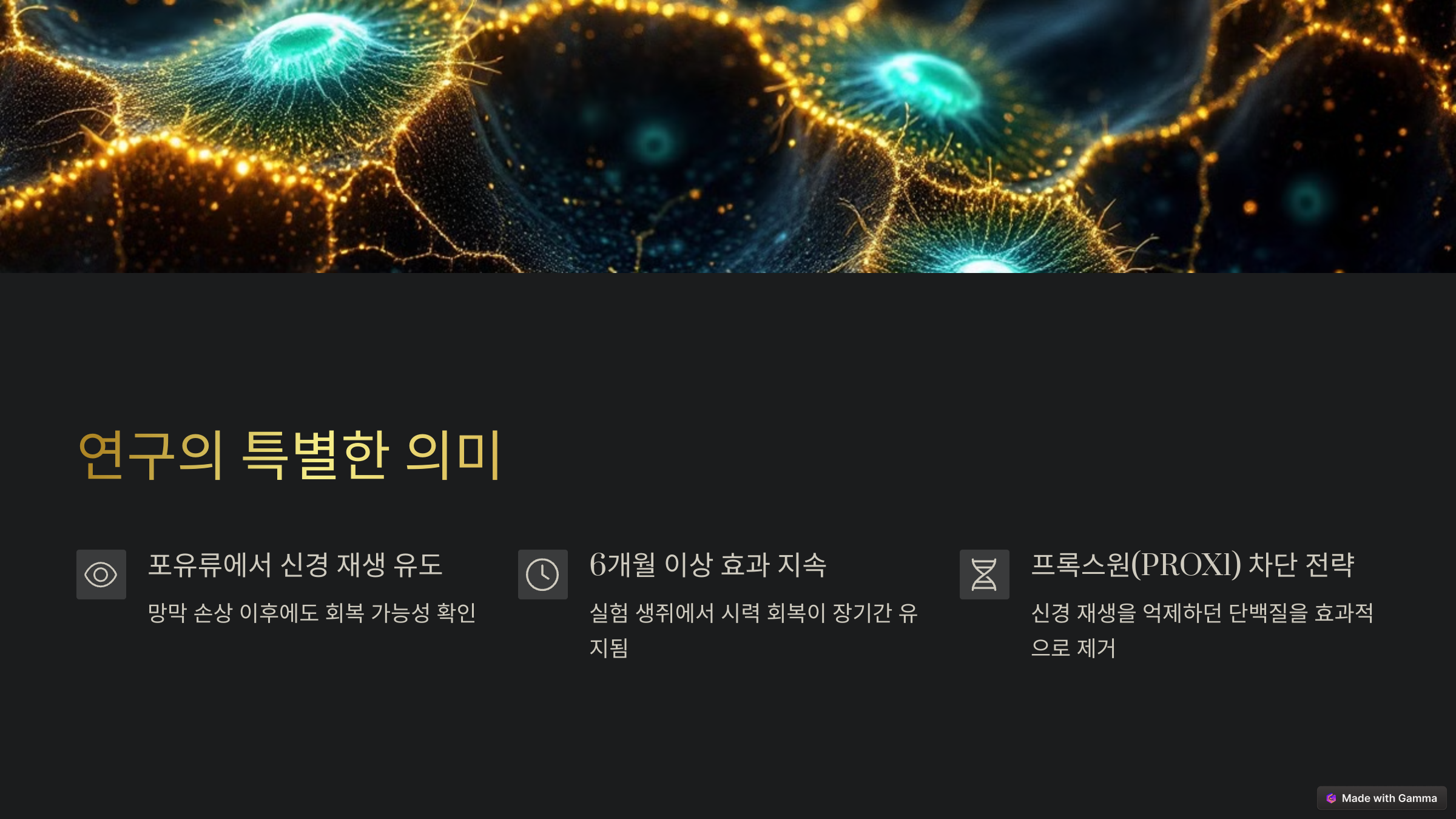 | 실험 결과 | 생쥐에서 망막 재생 및 시력 회복, 효과 6개월 이상 유지 |