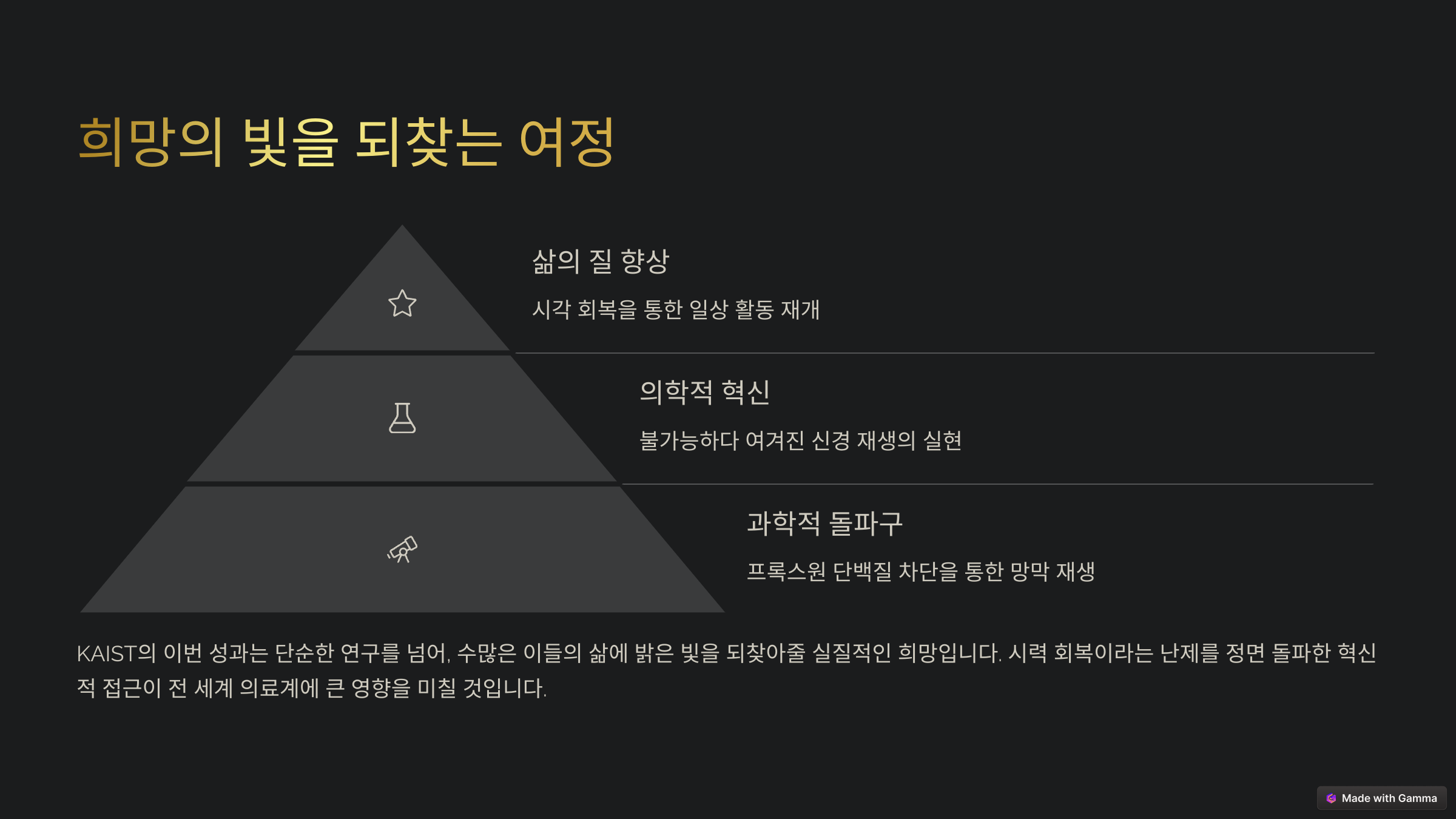 KAIST의 이번 성과는 단순한 연구를 넘어, 수많은 이들의 삶에 밝은 빛을 되찾아줄 실질적인 희망입니다.